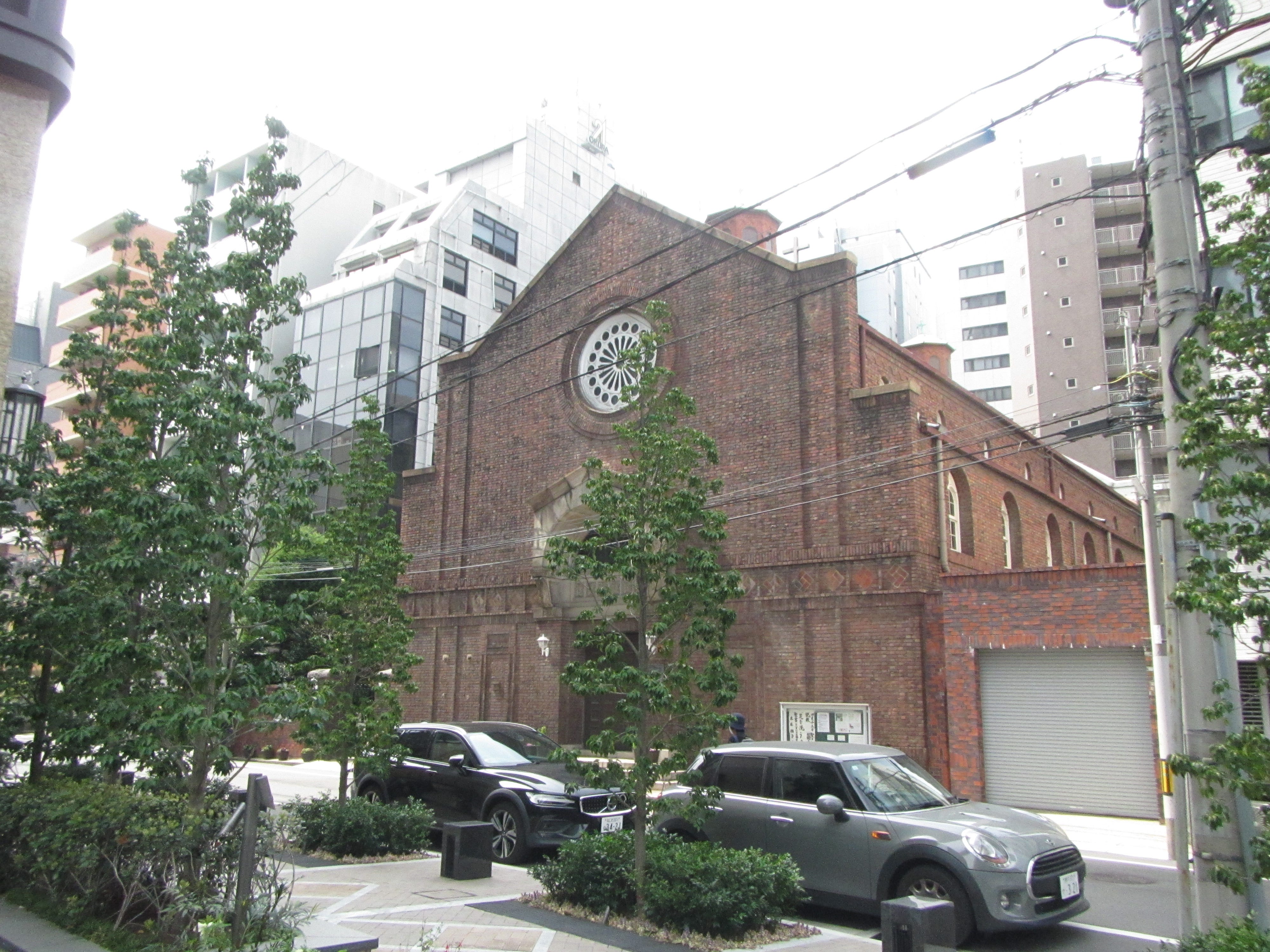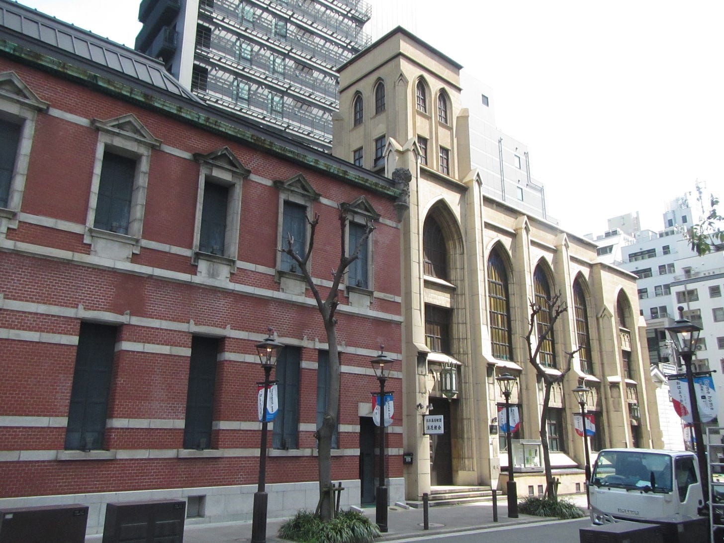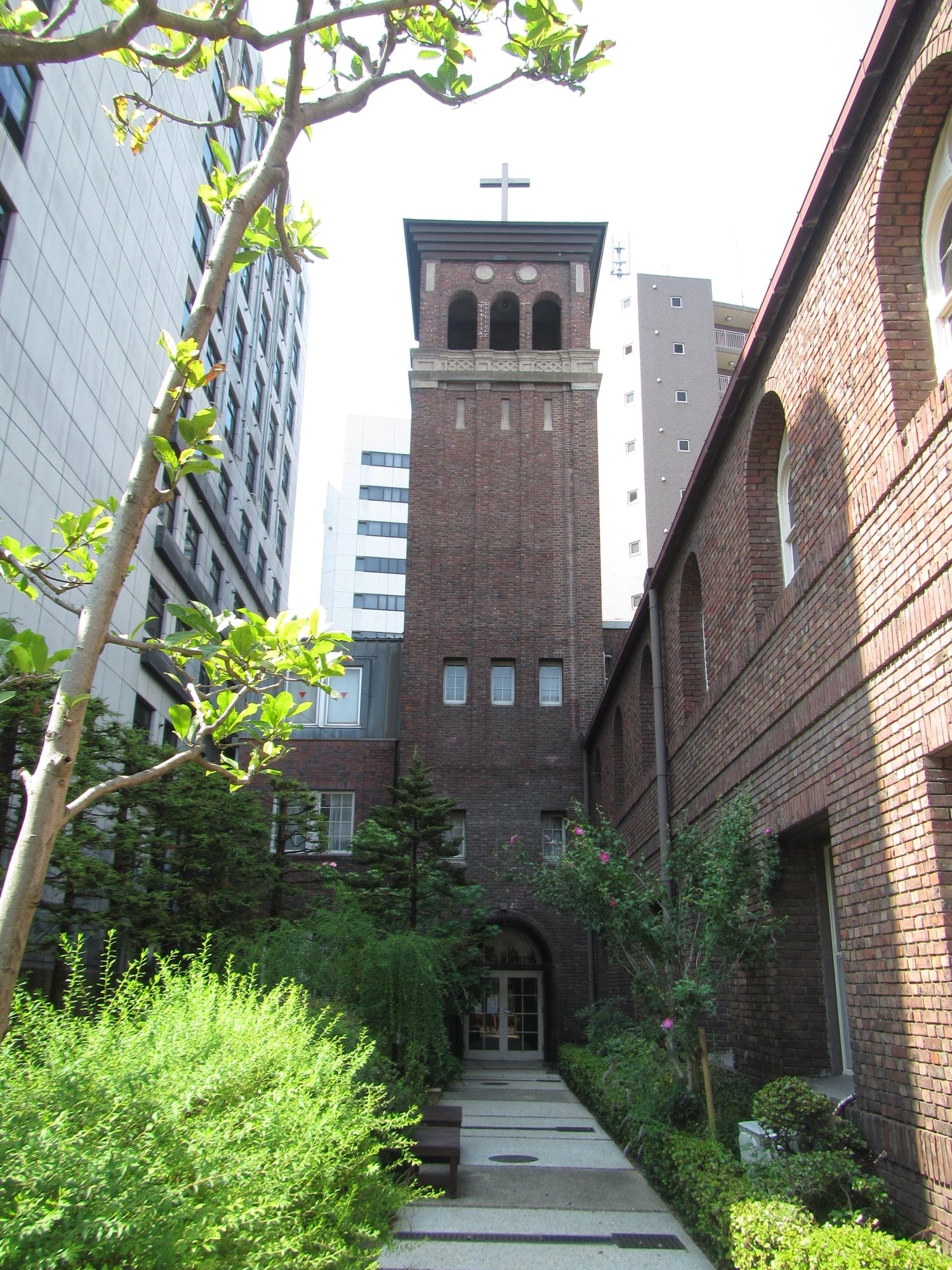 The second church was the UCCJ’s Ōsaka Church, built in 1922, and also designed by Vories, which I found much more attractive than Naniwa Church. Neo-Romanesque and mellow brick, with ornate details in the brickwork, the façade looks like a church in a crowded Spanish or Italian city. At one side, the narrow garden with an Italianate tower at the end gives the feeling of a convent. This church also used to be Congregationalist, and was founded by US missionaries in the 1870s.
