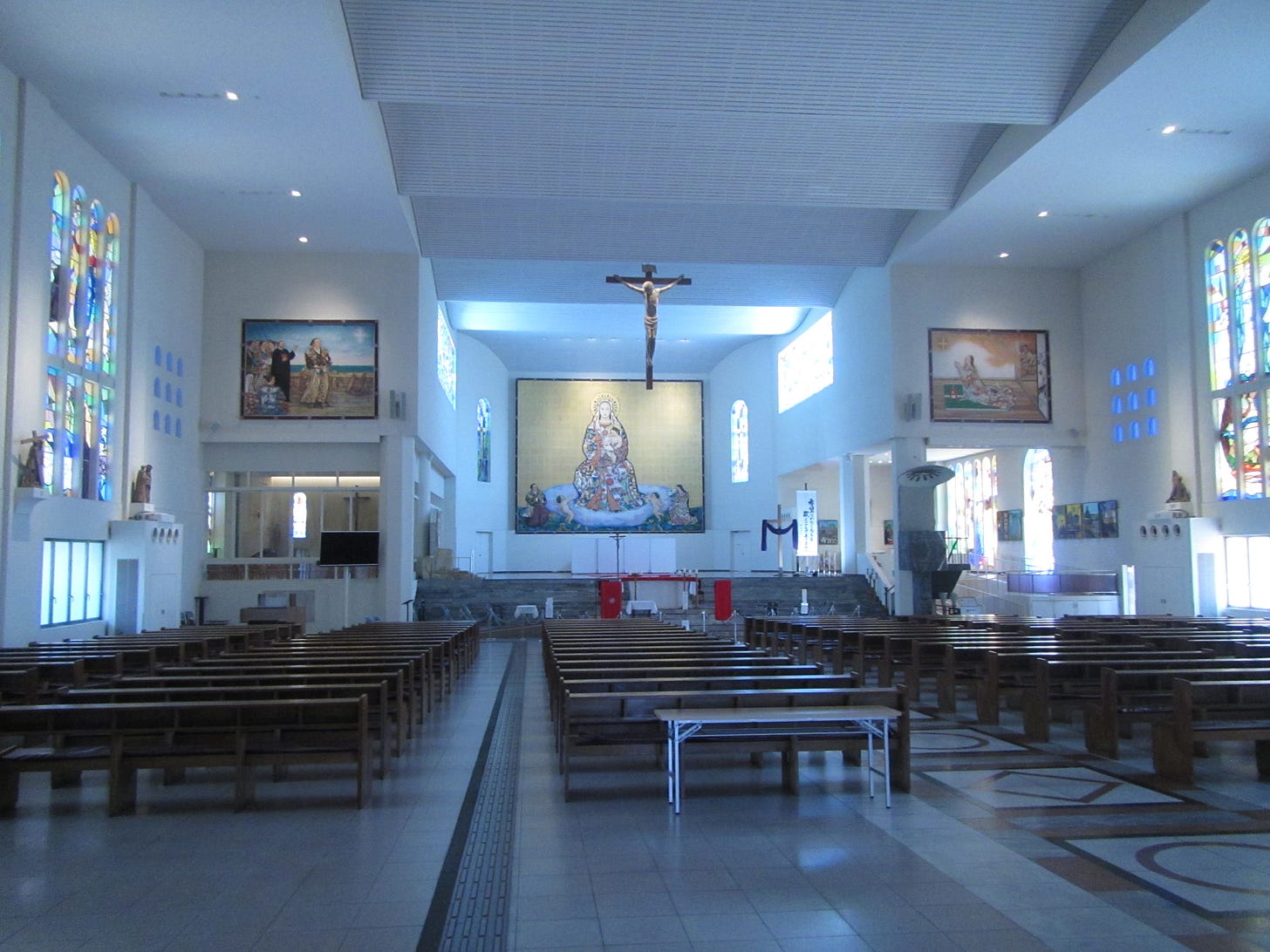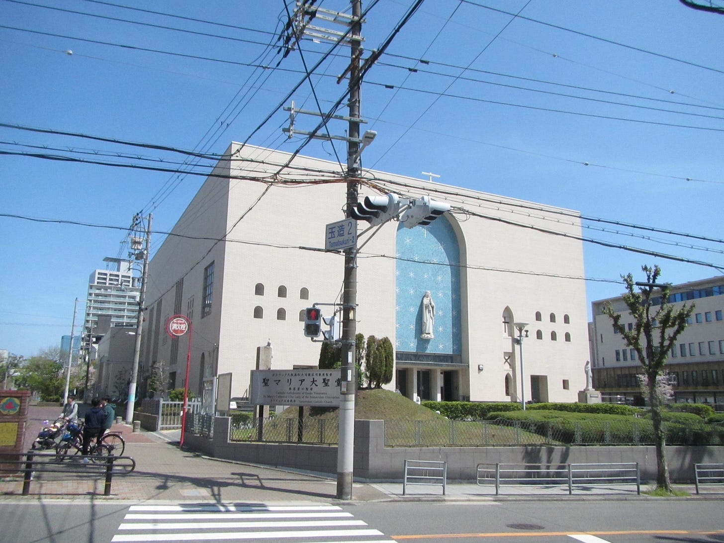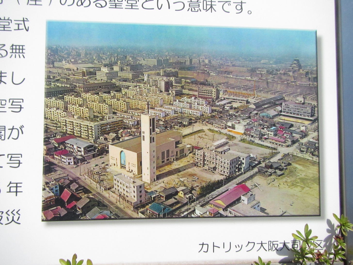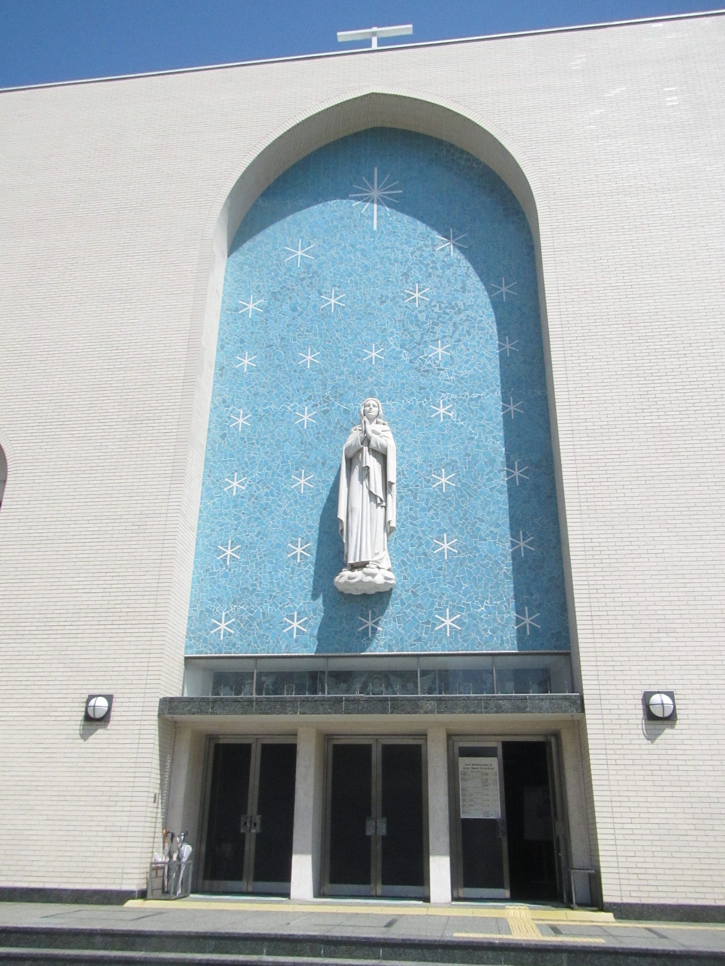 St. Mary’s Cathedral, the seat of the Archdiocese of Ōsaka, is a Modernist building, built in 1963 on the site of an 1894 building destroyed by the bombing in 1945. Designed by Hasebe Eikichi (1885–1960), it won several awards, but makes me think of a Costco. To my mind, the only feature of architectural interest is the large recessed area on the outside, above the front door, which includes a marble statue of the Immaculate Conception, and is covered with sky-blue taizan tiles, and decorated with stars. The cathedral had a bell-tower, but that was demolished after the earthquake of 1995.