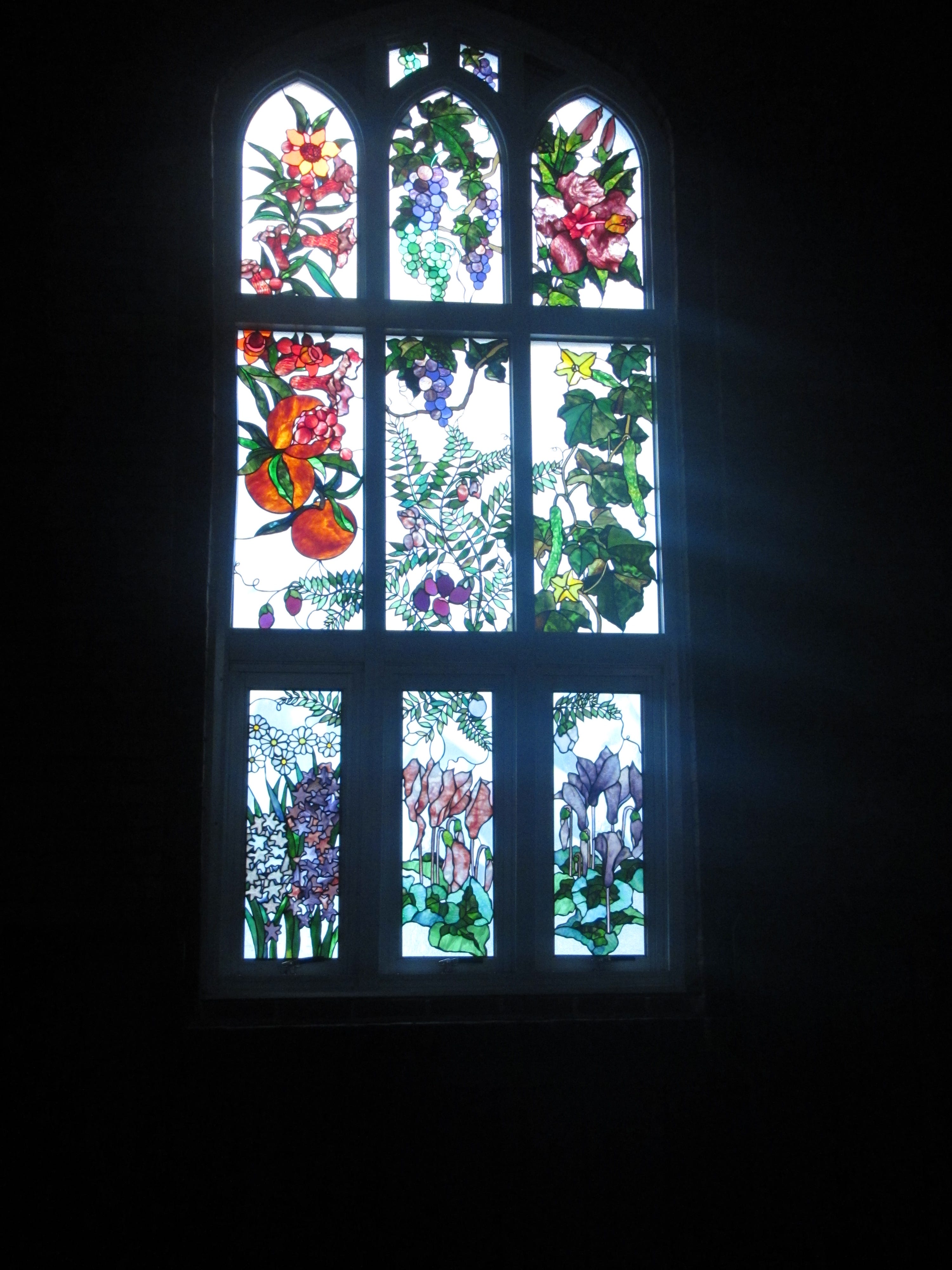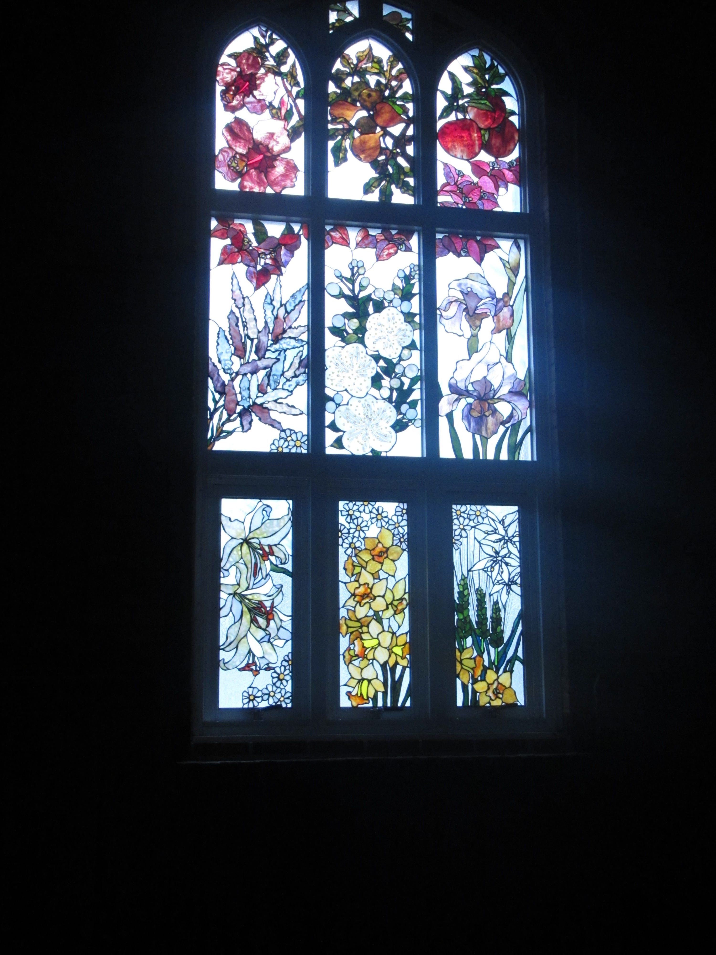 Getting now into the port district, there was the last church; the Anglican cathedral, Kawaguchi Christ Church. Built in 1920, and designed by the US mission architect William Wilson, it is the oldest extant church in Ōsaka. To English eyes, it is a rather dull, red-brick parish church, but the interior is more attractive; the mellow brick and Romanesque design makes it look much older, putting me in mind of an Italian village church. On one wall there are stained-glass windows in the style of botanical drawings, made in 1993 by Suzuki Chikako, showing fruits and other plants mentioned in the Bible. The church, founded in 1870, was the first church in the Ōsaka area. That was before legalisation of Christianity in 1873, so it mainly served foreigners.